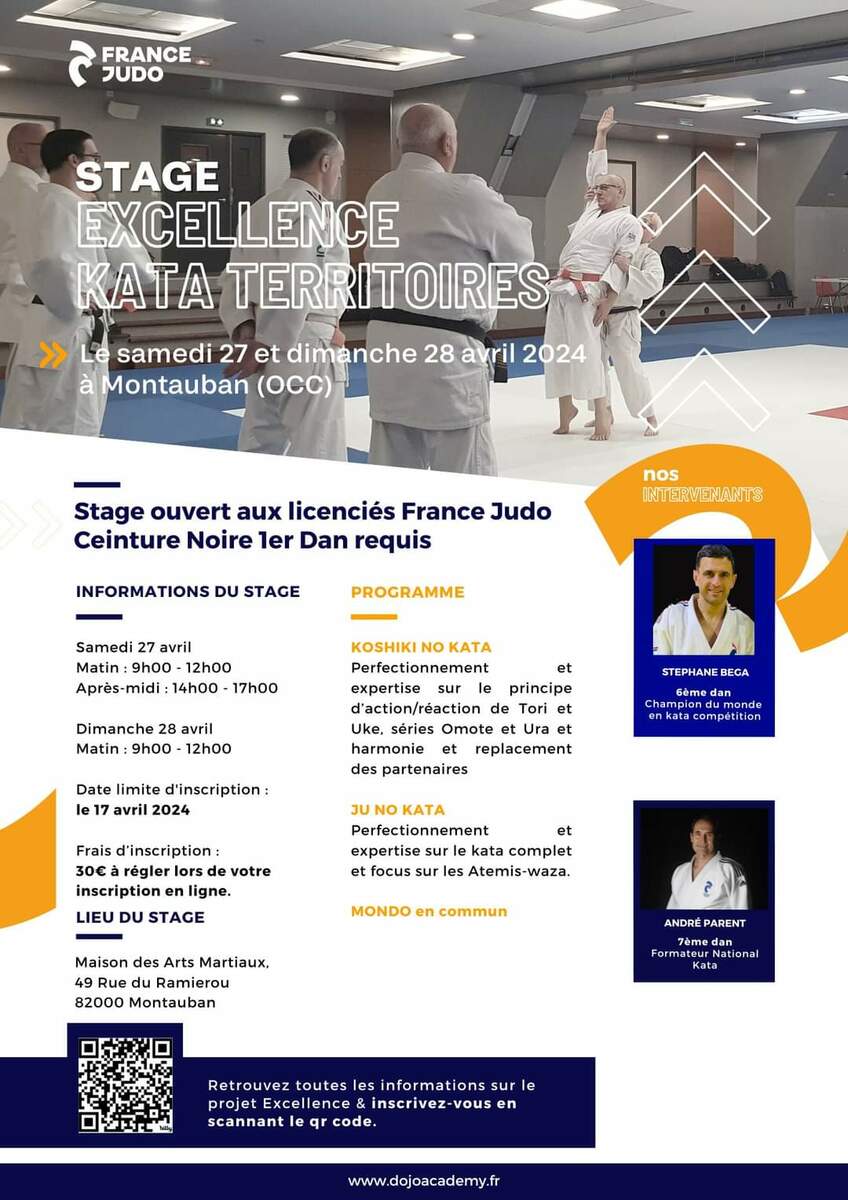 Dans le cadre du développement du judo au plan national défini dans le projet excellence Kata porté par F. Demonfaucon, notre club recevait : André PARENT 7ième Dan, formateur national kata et Stéphane BEGA 6ième Dan, champion du monde kata. Alexandra Soriano était présente en qualité de membre du conseil d’administration fédéral, mais également sur le tatamis pour travailler avec nous. Ces deux journées furent l’occasion de perfectionner deux katas d’excellence :